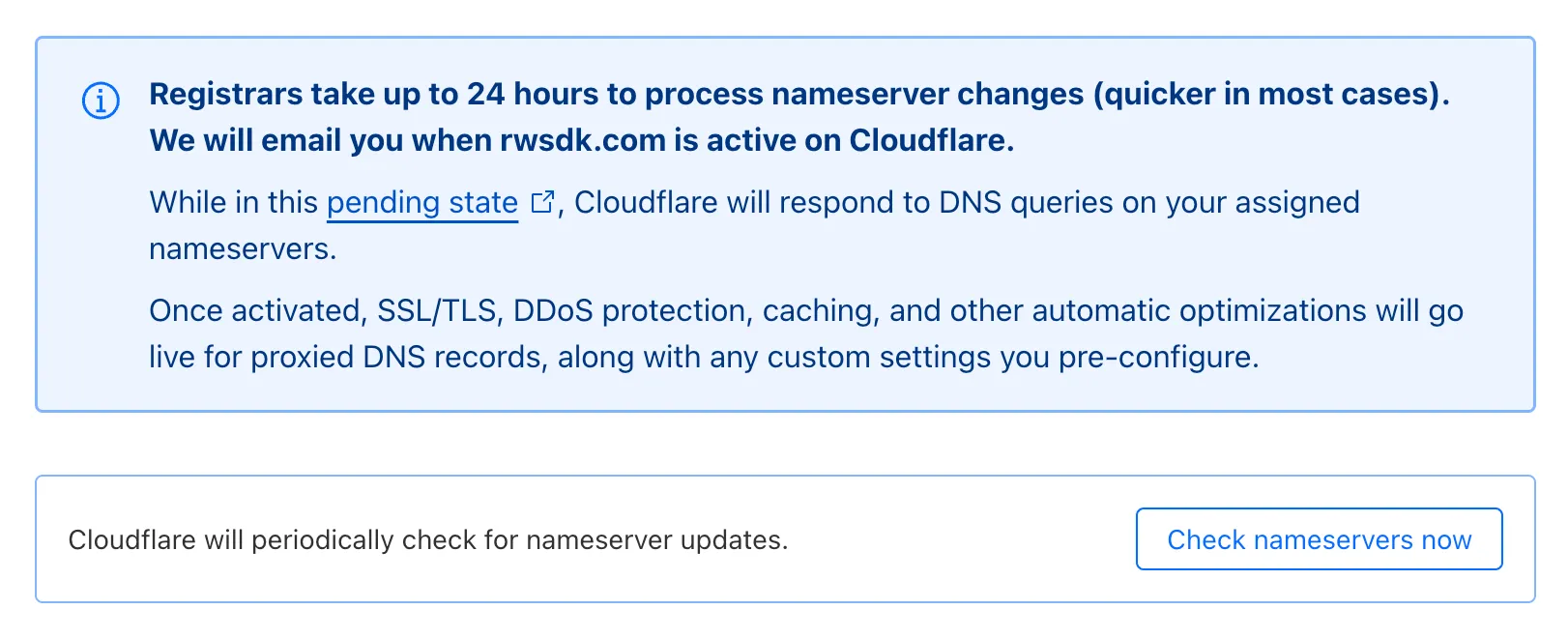 It’ll now present you with a note that it can take some time to process nameserver changes. From here, you can just wait until Cloudflare emails you, but for the impatiant amongst us, Cloudflare offers a Check nameservers now button.