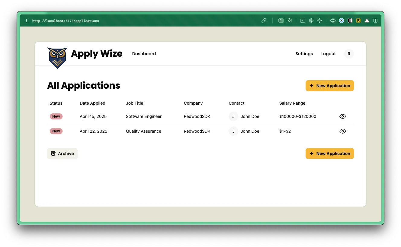 Now, let’s test this out. Fill out the form, click the “Create” button, and you should be redirected to the applications page and see your new application in the list. 😎